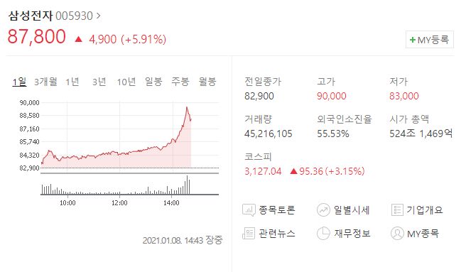 친구가 느닷없이 카톡을 합니다. 구만전자 될 것 같다고 말이죠. 삼성전자 작년 초에 살 때 4만원대였는데, 어느새 8만 원이 넘었고, 지금 제가 보고 있는 삼전 시세는 정말 9만전자가 될 것 같은 분위기입니다.